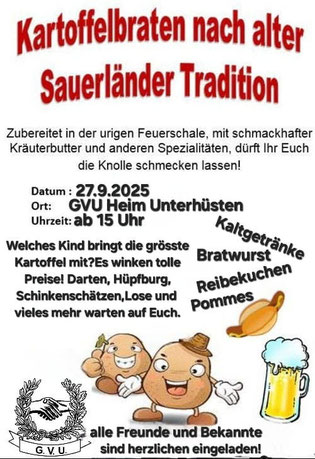 Am letzten Samstag im September ist in Unterhüsten Kartoffelfeuer. Und so konnte die G.V.U.-Familie kürzlich trotz durchwachsenem Wetter über 100 Gäste aus der Nachbarschaft, den befreundeten Vereinen und Institutionen und auch aus der Lokalpolitik im und am Vereinsheim an der Ruhr begrüßen.Ebenfalls war das älteste G.V.U.-Mitglied, Elie Jadoul, mit seinen mittlerweile 92 Lenzen aus seiner Wahlheimat Hagen angereist.